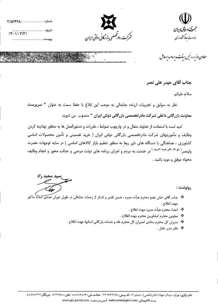 در متن حکم صادره از سوی معاون وزیر جهاد کشاورزی خطاب به حیدرعلی نصر آمده است: نظر به سوابق و تجربیات ارزنده جنابعالی، به موجب این حکم با حفظ سمت به عنوان سرپرست معاونت بازرگانی داخلی شرکت بازرگانی دولتی ایران منصوب میشوید.