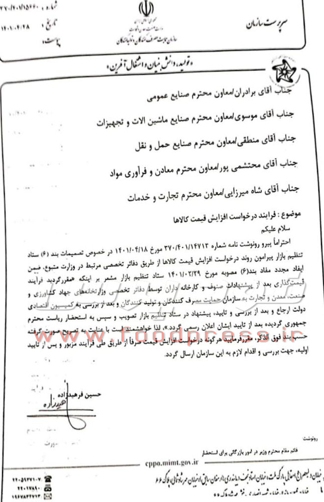 احتراماً پیرو رونوشت نامه شماره ۳۷۰/۴۰۱/۱۴۷۱۳ مورخ ۱۴۰۱/۰۴/۱۸ در خصوص تصمیمات بند (۶) ستاد تنظیم بازار پیرامون روند درخواست افزایش قیمت کالاها از طریق دفاتر تخصصی مرتبط در وزارت متبوع، ضمن ایفاد مجدد مفاد بند(۶) مصوبه مورخ ۱۴۰۱/۰۳/۲۹ ستاد تنظیم بازار مشعر بر اینکه «مقرر گردید فرایند قیمت گذاری بعد از پیشنهادات صنوف و کارخانه داران توسط دفاتر تخصصی وزارتخانه های جهاد کشاورزی و صنعت، معدن و تجارت به سازمان حمایت مصرف کنندگان و تولید کنندگان و بعد از بررسی به کمیسیون اقتصادی دولت ارجاع و بعد از بررسی و تایید، پیشنهاد در ستاد تنظیم بازار تصویب و سپس به استحضار ریاست محترم جمهوری گردیده بعد از تایید ایشان اعلان رسمی گردد.»، لذا خواهشمند است با عنایت به تصریح صورت گرفته حسب بند فوق الذکر، مقررفرمایید هرگونه درخواست افزایش قیمت صرفاً از طریق طی فرآیند مزبور و پس از تایید اولیه، جهت بررسی و اقدام لازم به این سازمان ارسال گردد.