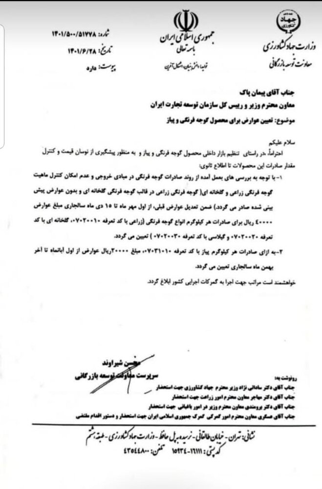 همچنین به ازای صادرات هر کیلوگرم پیاز با کد تعرفه ۰۷۰۳۱۰۱۰، مبلغ ۲۰,۰۰۰ ریال عوارض از اول آبانماه تا آخر بهمن ماه سالجاری تعیین می‌شود.