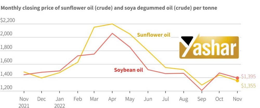 در حال حاضر، روغن آفتابگردان خام در هند با قیمت حدود ١٣٠٠ دلار در هر تن، تحویل بنادر هند برای دوره حمل دسامبر در مقایسه با روغن سویا خام با قیمت ١٣٢٠ دلار عرضه می شود. باید در نظر داشت که روند روغنکشی از دانه آفتابگردان در روسیه شتاب بیشتری گرفته است، روسیه روغن را با قیمتهای رقابتی برای کاهش ذخایر عرضه میکند، این در حالی که فروشندگان در اوکراین سعی میکنند از مدت زمان باقی مانده در توافق کریدور غلات نسبت به صادرات بیشتر روغن خام آفتابگردان هم استفاده کنند. البته، به این شرایط موجود که بر میزان عرضه روغن کمک می کند، باید میزان ذخایر حاصل از برداشت فصل گذشته در روسیه و اوکراین را هم در نظر گرفت که می تواند در چند ماه آینده بر قیمت ها فشار بیاورد.
