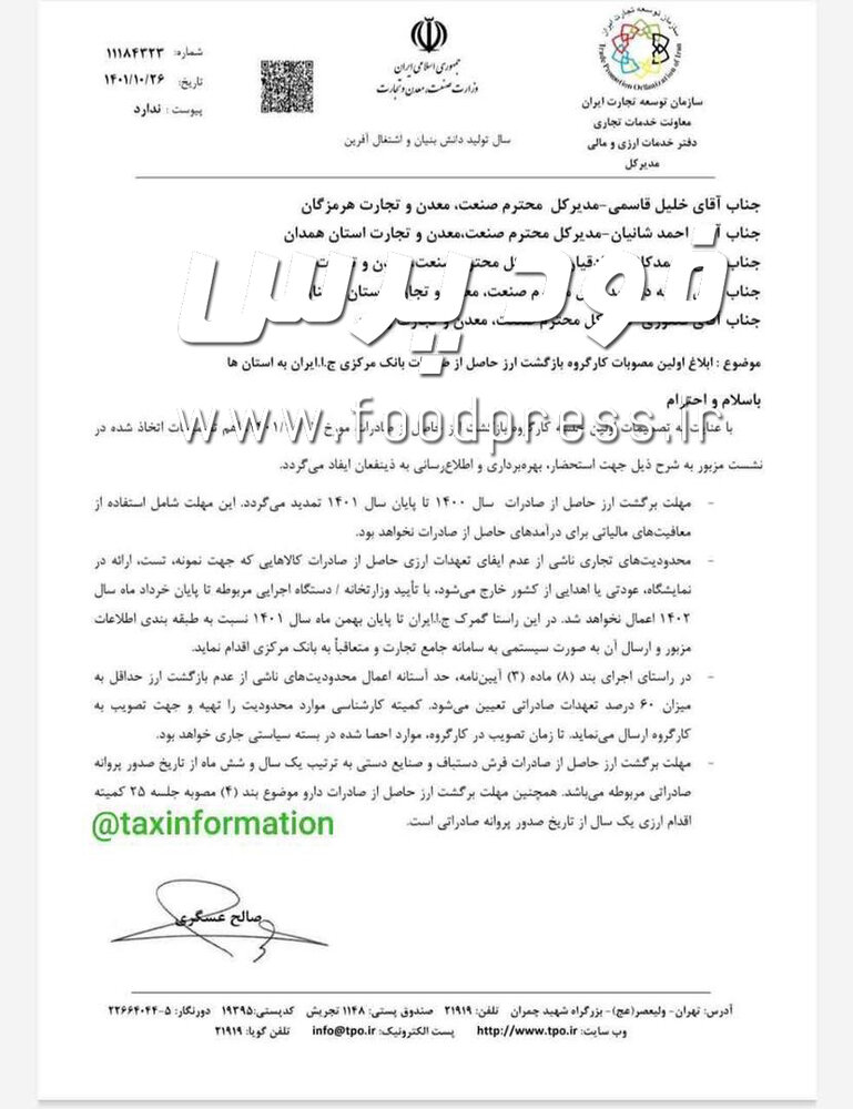 به گزارش پایگاه خبری اقتصادغذا «فود پرس»، سازمان توسعه تجارت در نامه ای مصوبات اولین جلسه کارگروه بازگشت ارز حاصل از صادرات مورخ ۱۴۰۱/۱۰/۱۴ را به شرح زیر ابلاغ کرد.