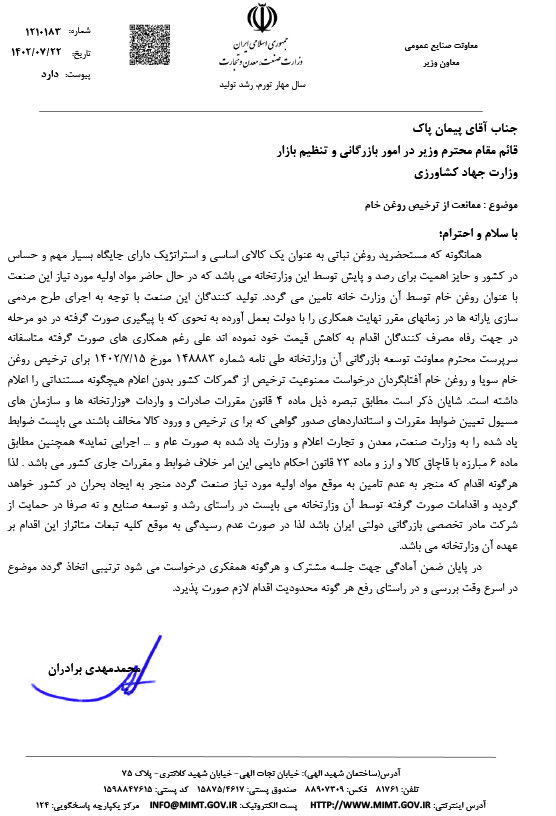 به گزارش پایگاه خبری اقتصاد غذا «فود پرس»، محمد مهدی برادران معاون صنایع عمومی وزیر صنعت، معدن و تجارت در نامه ای به علیرضا پیمان پاک قائممقام وزیر جهاد کشاورزی در امور بازرگانی و تنظیم بازار نوشت: همانگونه که مستحضرید روغن نباتی به عنوان یک کالای اساسی و استراتژیک دارای جایگاه بسیار مهم و حساس در کشور و حایز اهمیت برای رصد و پایش توسط این وزارتخانه میباشد که در حال حاضر مواداولیه مورد نیاز این صنعت با عنوان روغن خام توسط آن وزارتخانه تامین میگردد. تولیدکنندگان این صنعت باتوجه به اجرای طرح مردمیسازی یارانهها در زمانهای مقرر نهایت همکاری را با دولت به عمل آورده به نحوی که با پیگیری صورت گرفته در دو مرحله در جهت رفاه مصرفکنندگان اقدام به کاهش قیمت خود نمودهاند علیرغم همکاریهای صورت گرفته متاسفانه سرپرست محترم معاونت توسعه بازرگانی آن وزارتخانه طی نامه شماره ۱۴۸۸۸۳ مورخ ۱۵/۷/۱۴۰۲ برای ترخیص روغن خام سویا و روغن خام آفتابگردان درخواست ممنوعیت ترخیص از گمرکات کشور بدون اعلام هیچگونه مستنداتی را اعلام داشته است.