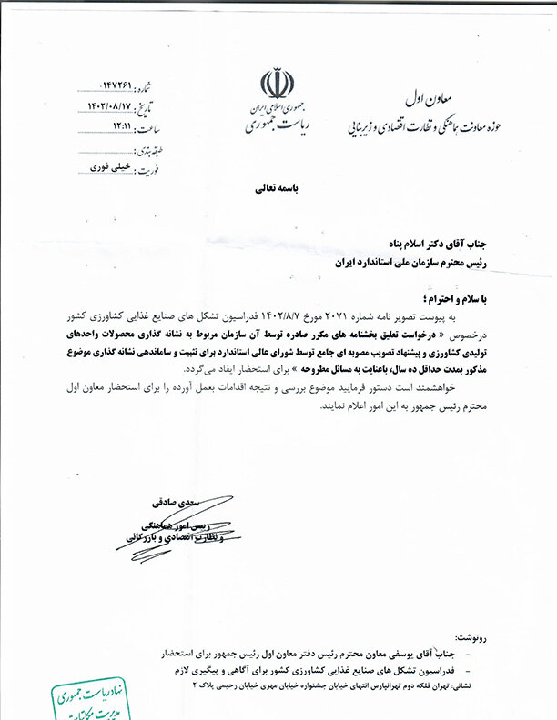 به گزارش پایگاه خبری اقتصادغذا «فود پرس»، سعدی صادقی رئیس امور هماهنگی و نظارت اقتصادی و بازرگانی در این نامه خطاب به دکتر مهدی اسلامپناه رئیس سازمان ملی استاندارد ایران نوشت: به پیوست تصویرنامه شماره ۲۰۷۱ مورخ ۱۴۰۲/۰۸/۰۷ فدراسیون تشکلهای صنایع غذایی کشاورزی کشور درخصوص «درخواست تعلیق بخشنامههای مکرر صادره توسط آن سازمان مربوط به نشانهگذاری محصولات واحدهای تولیدی کشاورزی و پیشنهاد تصویب مصوبهای جامع توسط شورای عالی استاندارد برای تثبیت و ساماندهی نشانهگذاری موضوع مذکور به مدت حداقل ده سال، با عنایت به مسائل مطروحه» برای استحضار ایفاد میگردد.