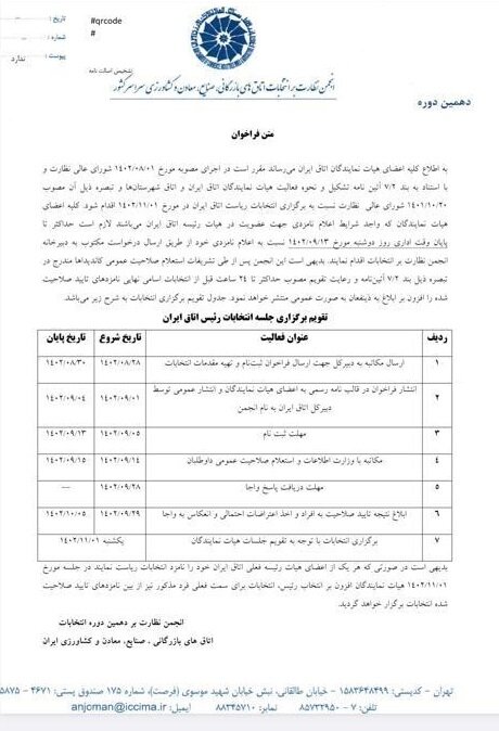 به گزارش پایگاه خبری اقتصادغذا «، فودپرس»، پس از کش و قوس های فراوان و پس از اعلام نظر صریح شورای عالی نظارت مبنی بر برکناری حسین سلاح ورزی از ریاست اتاق ایران، انجمن نظارت بر دهمین انتخابات اتاق بازرگانی، صنایع، معادن و کشاورزی ایران با پذیرش این رای، در فراخوانی روند و تقویم برگزاری جلسه انتخابات رئیس اتاق ایران را منتشر کرد.