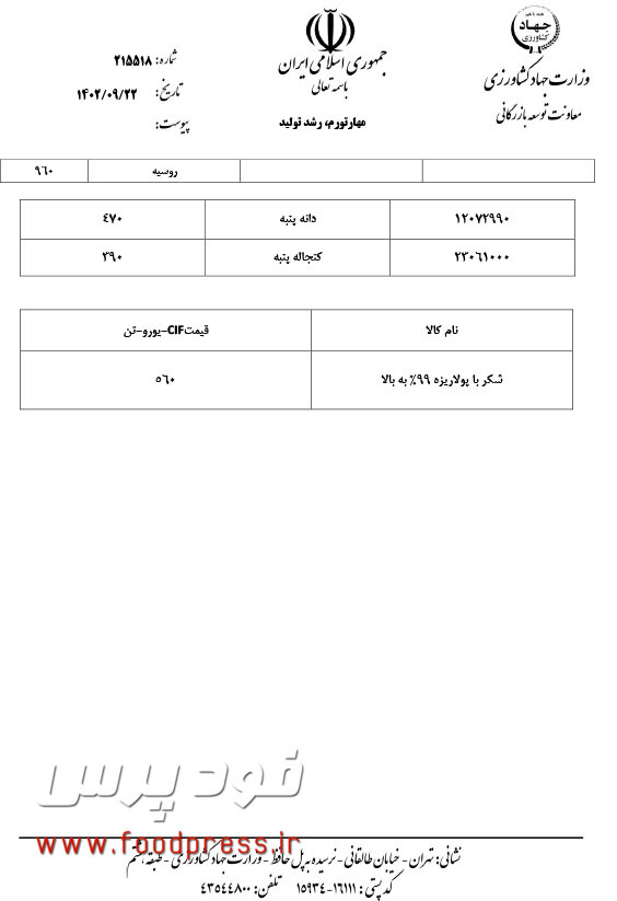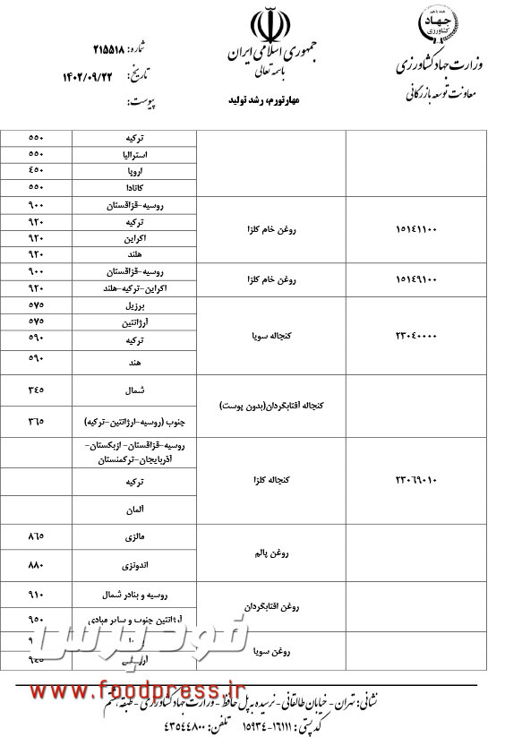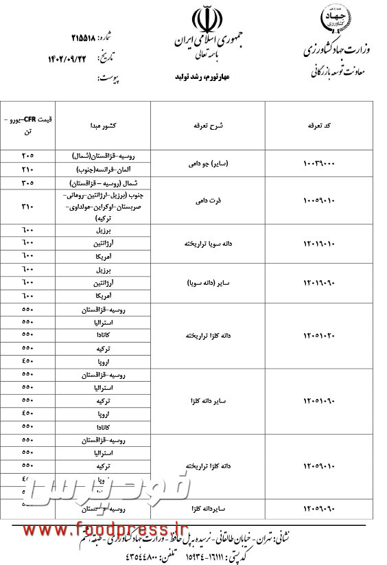 پیرو دعوتنامه شماره ۲۱۳۵۷۳ مورخ ۱۴۰۲/۰۹/۲۱ و برگزاری جلسه کمیته بررسی و تعیین قیمت های جهانی و سقف ارزی واردات کالاهای اساسی و نهاده ها در مورخ ۱۴۰۲/۰۹/۲۲ از ساعت ۱۱ در محل معاونت توسعه بازرگانی با حضور نمایندگان محترم بخش خصوصی اتحادیه واردکنندگان نهاده های دامی انجمن غلات، انجمن صنفی صنایع روغن نباتی، ایران انجمن صنفی کارخانجات صنایع روغنکشی و انجمن روغن و چربی های خوراکی، سازمان بازرسی کل کشور و دفتر بازرسی و نظارت بر کالاهای اساسی و محصولات کشاورزی و مدیران معاونت توسعه بازرگانی وزارت جهاد کشاورزی و شرکت مادر تخصصی بازرگانی دولتی ایران و گمرک ج.ا.ا ، پس از استماع نظرات و دریافت پیشنهادات، ضمن توافق با بخش خصوصی برای تامین نظر آن بخش در جهت تسهیل در جریان ورود کالاهای اساسی و نهاده ها به کشور، سقف قیمت های اعلامی جهت درج در سیستم ثبت سفارشات به شرح پیوست اعلام می گردد.