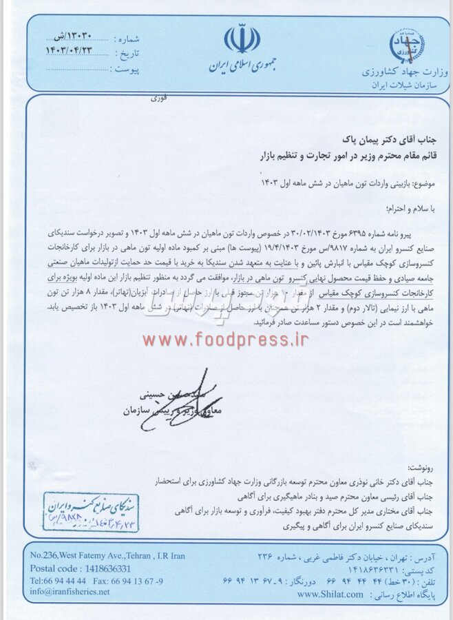 به گزارش پایگاه خبری اقتصادغذا «فود پرس»، سید حسین حسینی رئیس سازمان شیلات ایارن در نامه ای به علیرضا پیمان پاک قائم مقام وزیر جهاد کشاورزی در امور تجارت و تنظیم بازار در خصوص بازبینی واردات تون ماهیان در شش ماهه اول ۱۴۰۳ نوشت: پیرو نامه شماره ۶۳۹۵ مورخ ۱۴۰۳/۰۲/۳۰ در خصوص واردات تون ماهیان در شش ماهه اول ۱۴۰۳ و تصویر درخواست سندیکای صنایع کنسرو ایران به شماره ۹۸۱۷س مورخ ۱۴۰۳/۴/۱۹) پیوست ها مبنی بر کمبود ماده اولیه تون ماهی در بازار برای کارخانجات کنسروسازی کوچک مقیاس با انبارش پائین و با عنایت به متعهد شدن سندیکا به خرید با قیمت حد حمایت از تولیدات ماهیان صنعتی جامعه صیادی و حفظ قیمت محصول نهایی کنسرو تون ماهی در بازار موافقت می گردد به منظور تنظیم بازار این ماده اولیه به ویژه برای کارخانجات کنسروسازی کوچک مقیاس از مقدار ۱۰ هزار تن مجوز قبلی با ارز حاصل از صادرات آبزیان تهاتر)، مقدار ۸ هزار تن تون ماهی با ارز نیمایی تالار (دوم و مقدار ۲ هزار تن همچنان با ارز حاصل از صادرات تهاتر) در شش ماهه اول ۱۴۰۳ باز تخصیص یابد. خواهشمند است در این خصوص دستور مساعدت صادر فرمائید.