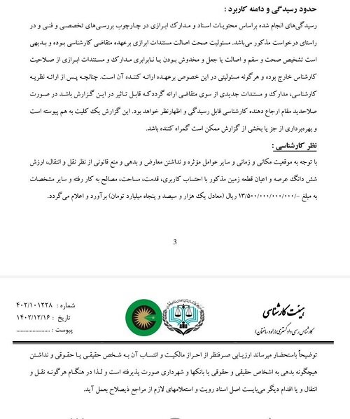 همچنین براساس سندی که منتشر شده است، هیات کارشناسی دادگستری، ارزش تقریبی زمین را در اردیبهشت سال ۱۴۰۲ معادل یک هزار میلیارد و ۳۵۰ میلیون تومان اعلام کرده است.