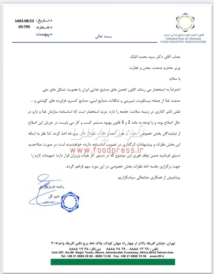 به گزارش پایگاه خبری اقتصاد غذا «فود پرس»، رشید عزیزپور دبیرکل کانون انجمن های نایع غذایی ایران در نامه به محمد اتابک وزیرصنعت، عدن و تجارت نوشت:کانون انجمن های صنایع غذایی ایران با عضویت تشکل های ملی صنعت غذا از جمله؛ بیسکویت، شیرینی و شکلات، صنایع لبنی، صنایع کنسرو، فراورده های گوشتی و ... نقش تاثیر گذاری در زمینه سلامت جامعه را دارد. مزید استحضار است که اساسنامه سازمان غذا و دارو در حال اصلاح بوده و با توجه به ماده 2 و 3 قانون بهبود مستمر کسب و کار می بایست در جریان این اصلاح از نمایندگان بخش خصوصی دعوت به عمل آمده و نظرات تشکل های مربوطه اخذ گردد. لذا نظر به اینکه این بخش نظرات و پیشنهادات اثرگذاری در تصویب اساسنامه دارند؛ خواهشمند است در صورت صلاحدید دستور فرمایید ضمن توقف فوری این موضوع که در دستور کار هیأت وزیران قرار دارد؛ تمهیدات لازم را جهت برگزاری جلسه اخذ نظرات بخش خصوصی در این مورد مهم فراهم گردد.