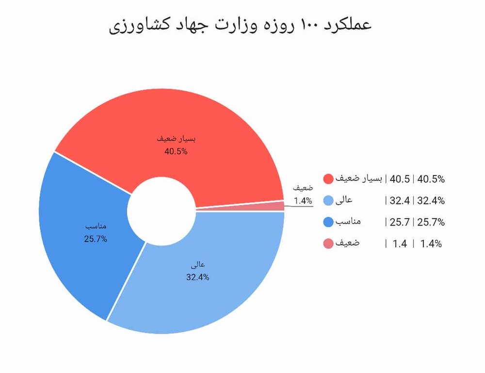 به گزارش پایگاه خبری اقتصادغذا «فود پرس» طی حدود ۲۰ روز از برگزاری نظر سنجی ۷۵۳۶ نفر از مخاطبانمان که شامل فعالان صنایع غذایی و کشاورزی هستند در این نظر سنجی شرکت کردند که بیش از ۴۰.۵ درصد شرکت کنندگان عملکرد وزیر جهاد کشاورزی دولت چهاردهم در ۱۰۰ روز نخست در زمینه انتصابات، حمایت از تولید داخل و تنظیم بازار را بسیار ضعیف دانستند، ۲۵.۷ درصد مناسب، ۳۲.۴ درصد عالی و ۱.۴ درصد گزینه ضعیف را انتخاب کردند.