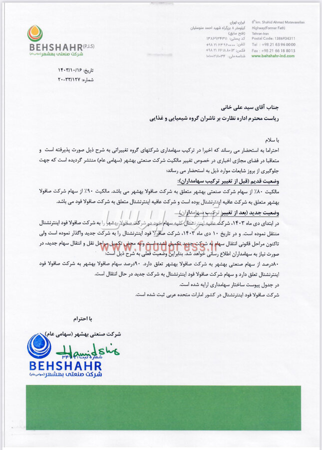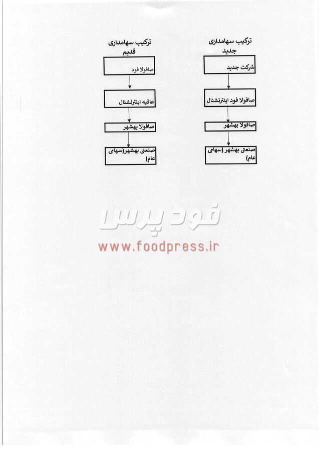 منتقل نموده است. و در تاریخ ۱۰ دی ماه ۱۴۰۳ شرکت صافولا فود اینترنشنال را به شرکت جدید واگذار نموده است ولی تاکنون مراحل قانونی انتقال سهام به شرکت جدید تکمیل نشده است و به محض تکمیل مراحل نقل و انتقال سهام جدید در صورت نیاز به سهامداران اطلاع رسانی خواهد شد. بنابراین وضعیت فعلی به شرح ذیل است.