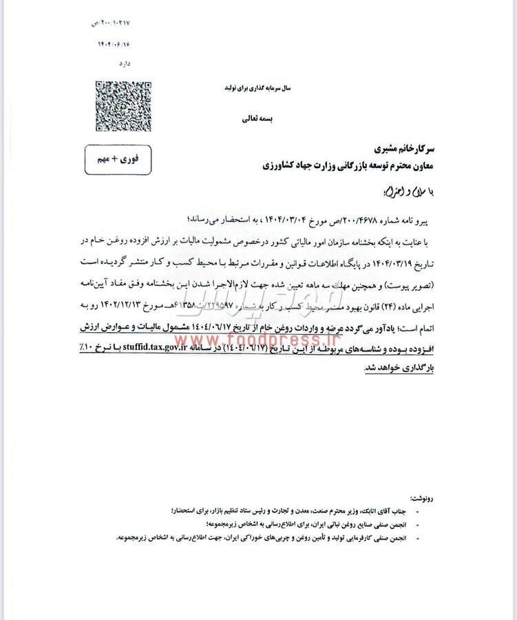 با اعلام سازمان امور مالیاتی عرضه و واردات روغن خام از تاریخ ۱۷ شهریور ماه مشمول ۱۰ درصد مالیات بر ارزش افزوده شد.